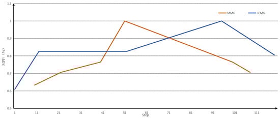 When analysing the fatigue state, the fatigue node of the muscle generally appeared earlier than that of the sEMG signal, but the downward trend of the MMG signal after entering fatigue had a smaller range of variation than that of the sEMG signal, and it was not easy to differentiate the degree of muscle fatigue after entering fatigue with the MMG signal alone, and with the sEMG signal alone; the degree of muscle fatigue after entering fatigue could not be detected earlier, so that the fusion of the two could provide a better analysis of muscle fatigue. A comparison of the peak envelopes of the MPF eigenvalues of the two signals is shown in Figure 9.
