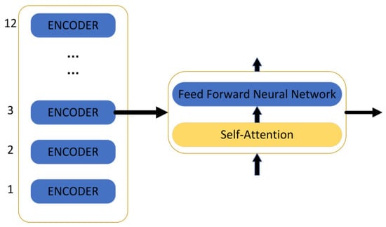 Taken together, the BERT model pre-trains deep bidirectional representations from unlabelled texts by carefully weighting the context before and after each layer, and constructs multiple natural language processing tasks, such as text categorisation, automated Q&A, and machine translation, adding only one additional output layer and then fine-tuning it. The BERT model achieved excellent results on a large number of text classification datasets. In this study, we chose the “bert-base-uncased” model, which has 12 hidden layers, a 768-dimensional tensor output, 12 self-attention heads, and a total of 110 M parameters, as shown in Figure 10.