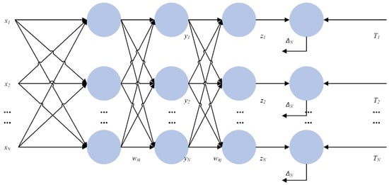 After selecting the data processing model, it is also necessary to combine the existing prediction models, and in this study, the error back-propagation neural network was selected to be combined with BERT. The back-propagation neural network, abbreviated as the BP network, is a multilayer neural network with three or more layers, where each layer consists of several neurons. The structure of a BP neural network is shown in Figure 11, which achieves full connectivity between each neuron in the left and right layers, i.e., each neuron in the left layer is connected to each neuron in the right layer, while there is no connection between the top and bottom neurons.