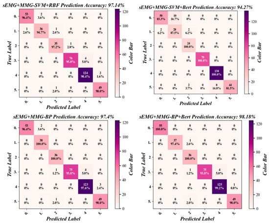 In this study, for the three established datasets, including the 6-dimensional sEMG dataset composed of six sEMG signals, the 6-dimensional MMG dataset composed of six MMG signals, and the 12-dimensional comprehensive dataset combining six sEMG signals and six MMG signals, the classification comparison of four algorithms was carried out for each of them, respectively. The four algorithms included BP, SVM + BERT, SVM + RBF, and BP + BERT, and each combination was repeated 10 times. The prediction results were subjected to confusion matrix analysis to obtain the confusion matrices of the four algorithms, as shown in Figure 13.