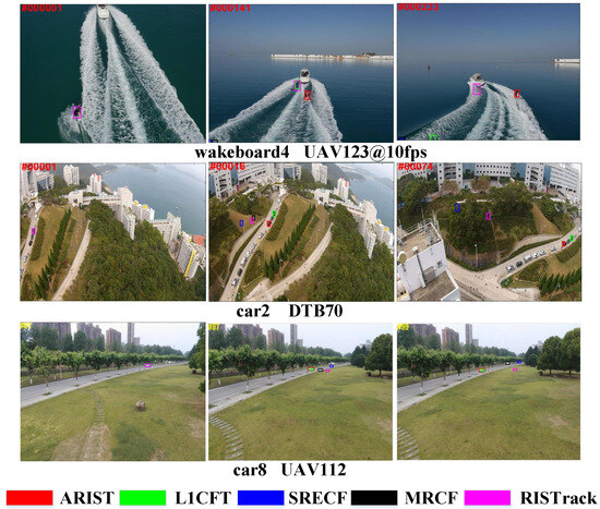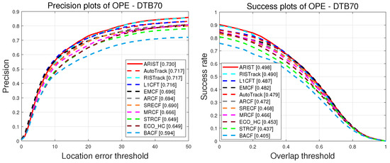 The proposed trackers were executed in MATLAB 2017a without any optimization. All of the experiments were implemented on a PC with an Intel Core i7-1165G7 CPU (2.80 GHz) and 16 GB of RAM. On DTB70, ARIST runs at about 41.3 FPS. The cell size used in HOG is 4 × 4, and the orientation bin number is 9. The adaptive-dimension feature coefficient is 23; the adaptive mapped fusion parameter is 0.89; and the frequency of switching the scale filter in the adaptive temporal scale intervals is set to 2. For more detailed information on the parameter settings, please refer to [20,28].