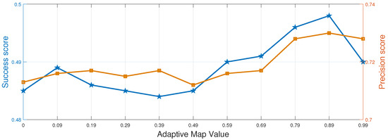 As described in Section 3.2, we employ an adaptive mapped-feature response based on dimensionality reduction and histogram scores in ARIST. We analyze the adaptive map values in multiple features on DTB70. Figure 3 shows the tracking performance, in terms of precision and success scores, throughout the OPE for different adaptive map values. We observe that the performance of ARIST is inferior to that of the state-of-the-art trackers when using only the fixed Hann window.However, the precision and success scores of ARIST continue to improve with increasing adaptive map values of the histogram scores, until a histogram score-based adaptive map value of 0.89 is reached. We set the adaptive map value to 0.89 between the Hann window and the adaptive color map for all of our experiments.
