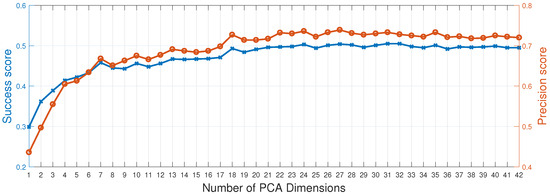 The dimensionality reduction technique is based on the standard principal component analysis applied in the adaptive mapped-feature response approach. The updated model template on the HOG+CN feature is defined as , which is employed to adaptively reduce the feature dimensions. Here, is zero, and represents the extracted HOG+CN features in the frame. Then, Equation (7) can be reformulated as by the linear Fourier transform . Finally, the updated model template can be adopted to construct a projection matrix , which is the low-dimensional subspace. The features can be projected onto this subspace by the projection matrix , which has a size of , where is the dimension of the compressed feature. The projection matrix is obtained by minimizing the objective function for reconstructing the updated model template :