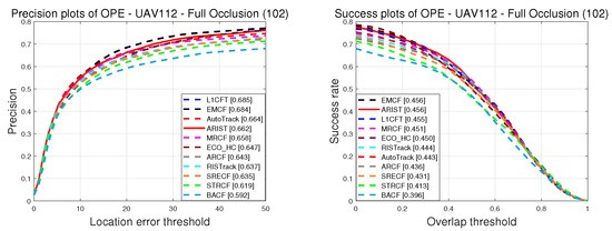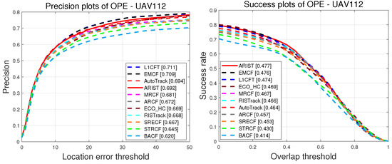 UAV112. The precision and success scores obtained during the OPE on UAV112 [3] are shown in Figure 6. It is evident that although the precision scores of ARIST are lower than those of AutoTrack, EMCF and L1CFT, the reported running times and success scores of the latter suffer as these trackers use more dimensional features and temporal scale intervals.Furthermore, ARIST, with precision and success scores of 69.2% and 47.7%, outperforms ECO_HC, ARCF, RISTrack, BACF, STRCF, SRECF and MRCF. Overall, the proposed tracker achieves comparable tracking performance to the state-of-the-art trackers.
