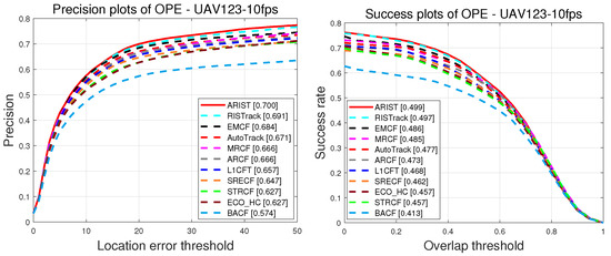 DTB70. Figure 5 shows the precision and success scores throughout the OPE on DTB70 [21]. Regarding the success scores, the proposed tracker outperforms the other state-of-the-art trackers, achieving success and precision scores 1.1% and 1.3%, respectively, higher than those of L1CFT, which was recently proposed in combination with a sparse regularization-enhanced correlation filter for UAV tracking. Furthermore, ARIST is 1.3% and 1.3% better than the recent AutoTrack and RISTrack, respectively, in terms of precision scores. Regarding precision and success scores obtained during the OPE on DTB70, the proposed tracker ranks at the top, achieving superior performance compared with the state-of-the-art trackers.