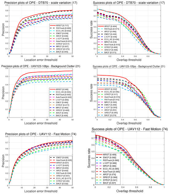 Attributeanalysis. For a more comprehensive evaluation of ARIST, Figure 8 shows the tracking results for the four most challenging attributes according to the OPE on DTB70, UAV112 and UAV123@10fps, with ARIST ranking among the top four. Among the existing methods, the RISTrack method performs well in terms of scale variation with regard to the precision (68.9%) and success (47.1%) scores, while the proposed ARIST algorithm achieves scores of 71.7% and 48.4%, respectively. The ECO_HC method performs well in terms of background clutter with regard to the precision (50.3%) and success (33.6%) scores, while the ARIST algorithm achieves scores of 54.9% and 35.2%. In terms of fast motion and full occlusion, ARIST achieves comparable results to EMCF and AutoTrack, which use more dimensional features and temporal scale intervals.