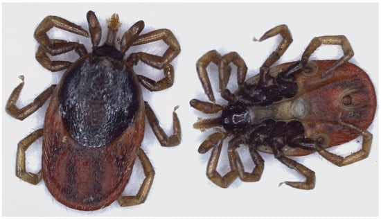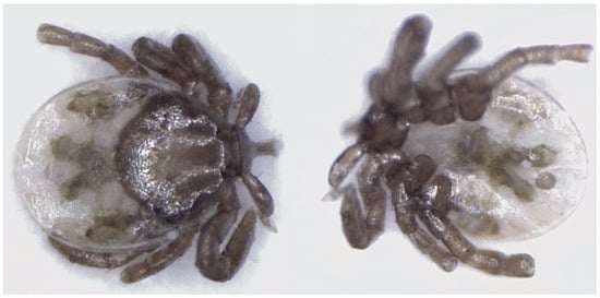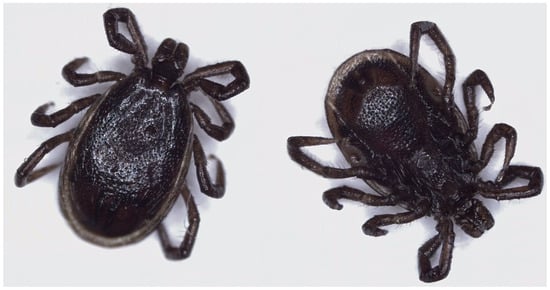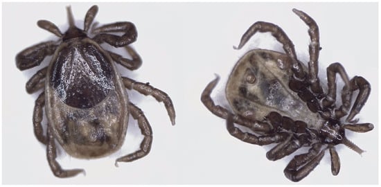 Ixodes ricinus, the most common tick species in Central Europe [1,2], is an external parasite tick from the Ixodidae family that feeds on wild and domesticated animals, also targetting humans. This tick poses a significant biological threat, transmitting at least 20 pathogens of medical and veterinary importance [3], including the tick-borne encephalitis virus, Borellia burgdorferi spirochetes—the causative agents of Lyme disease (also known as Lyme borreliosis) [4], and Anaplasma phagocytophilum, the agent of human granulocytic anaplasmosis [5]. The most clinically relevant pathogens among them are the tick-borne encephalitis virus (TBEV) and Borrelia burgdorferi (TB). In Poland, I. ricinus is the predominant tick species and the primary vector of tick-borne diseases in humans [6]. Ixodes ticks typically complete their life cycle within 3–6 years, depending on environmental conditions [7]. After hatching, they pass through three active stages—larva, nymph, and adult—each requiring a blood meal from a host [8]. Each stage of the tick’s life cycle (larvae (Figure 1), nymphs (Figure 2), adults (Figure 3 and Figure 4)) associated with specific hosts is crucial for its survival, and the risk of pathogen transmission increases progressively throughout these stages. Immature stages feed on small mammals, birds, or reptiles, while adults primarily feed on large mammals [9].