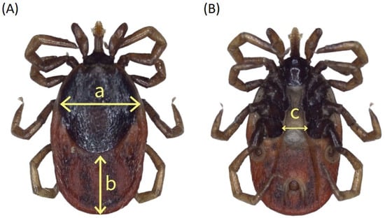 Dorsal (A) and ventral (B) views of an adult Ixodes ricinus. The scutal index is defined as the ratio between the length of the alloscutum (a) and the width of the scutum (b); the coxal index is defined as the ratio between the length of the alloscutum (a) and the distance between the basal coxae of the fourth pair of legs (c, coxal gap).