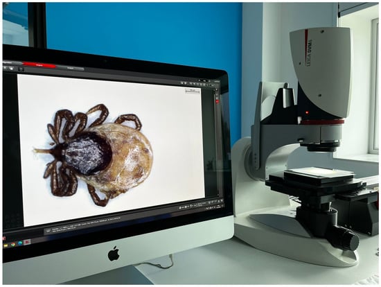 The dataset consisted of microscopic images of ticks collected from green areas in Zabrze, Poland, between April and October 2022. Ticks were gathered using a drag cloth method [1,48]. A total of 564 tick specimens were collected, preserved at −80 °C and photo-documented using DVM6A digital microscope (Leica Microsystems Heidelberg GmbH, Wetzlar, Germany). Morphological analysis was conducted by capturing high-resolution images of ticks using a Leica DVM6A (Figure 6) digital microscope equipped with a motorized stage and a 16:1 zoom system, offering a magnification range from 10× to 2350× and capable of resolving structural details as small as 0.4 µm. The system features a high resolution 1/2.3” CMOS camera sensor with a native resolution of 3648 × 2736 pixels and a pixel size of 1.67 × 1.67 µm. Images were acquired in high-resolution format (1600 × 1200 pixels, RGB, saved as JPG and TIFF files), showing dorsal and ventral views of the ticks. During image acquisition, the LED illumination ring of the DVM6A microscope was configured using the “Scene” mode in the LAS X (v5.2.2) software, which allows precise control over both the number and angle of active light sources. This enabled us to adjust the direction of illumination to minimize shadowing and eliminate surface reflections especially on the tick’s sclerotized dorsal shield. Light intensity was manually optimized for each image to ensure maximum anatomical detail visibility while avoiding overexposure (“burnout”) of bright regions. These adjustments ensured uniform and high-quality illumination across all specimens, improving both visual interpretation and the robustness of feature extraction in the CNN model.