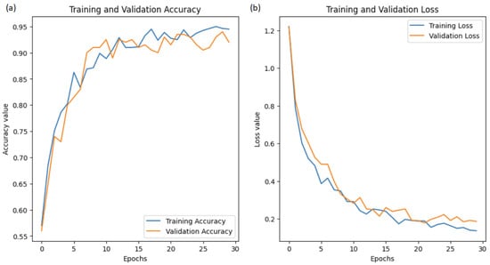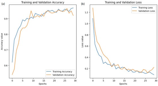 Results of classification: (a) training accuracy curve, (b) training loss curve. Accuracy and loss functions over 30 epochs during the training phase, RGB 320 × 320 pixels. Final accuracy: 98%.