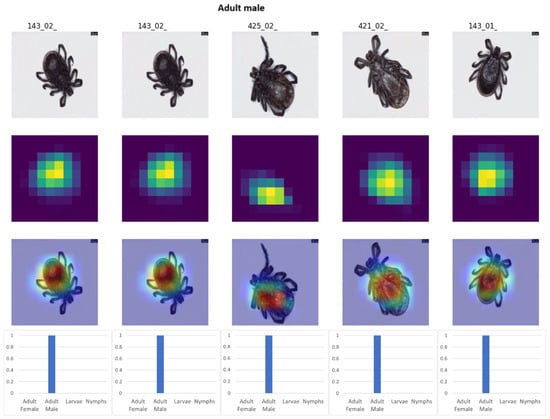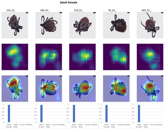 Further insights were provided by bar charts that presented the model’s confidence levels for each classification. As shown in Figure 8 and Figure 9, the model displayed high confidence in classifying most images, particularly in distinguishing adult developmental stages, likely due to the distinct dorsal shield seen in adult specimens. Examples of visualizations and classification results for adult ticks were presented, providing a clear assessment of the model’s ability to identify these developmental stages.