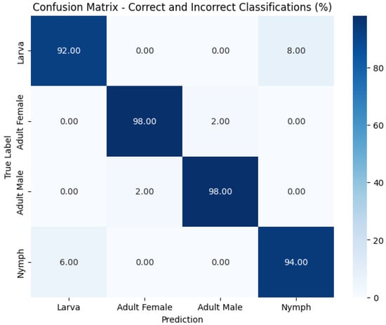 Overall, the model exhibited high effectiveness and stability, achieving satisfactory results on both RGB and grayscale images. The confusion matrix (Figure 11) demonstrates a high classification accuracy, as evident from the high percentages along the diagonal (from the top-left to the bottom-right). The values on the diagonal represent the correct classification for each class. The main misclassifications occur between “Larva” and “Nymph” as well as between “Adult Female” and “Adult Male”. This could indicate similarities in features between these categories, which makes distinguishing them more challenging (Figure 11).