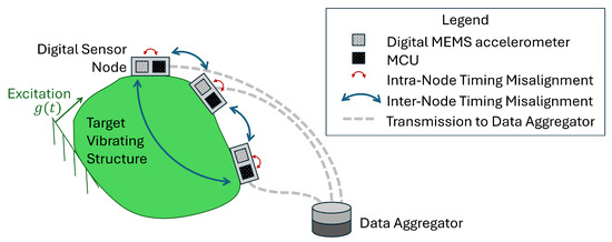 This paper, therefore, specifically focuses on the issue of lack of synchronization and does not consider the combined effects of other sources of uncertainty. Time misalignment occurs at two distinct levels within the sensor network (Figure 1). At the intra-node level, i.e., within a single digital node, the presence of multiple clock sources (e.g., in the ADC and MCU) or the instability of non-quartz-based clock sources results in data records sampled at non-constant time intervals. At the inter-node level, the lack of a master time reference among the sensor nodes leads to non-simultaneous sampling among DOFs. A first attempt to experimentally quantify sampling variability was conducted by D’Emilia et al. [6], in which a set of 25 MEMS-based sensors with digital interfaces—sourced from the same production batch—were tested at selected sine-dwell frequencies. The results revealed significant variability in the actual sampling rates among the sensors, as well as noticeable deviations from the nominal rate specified by the manufacturer. This fundamental issue must be addressed both during dynamic calibration [11] and under operational conditions, such as in SHM applications. The present work focuses on the latter.