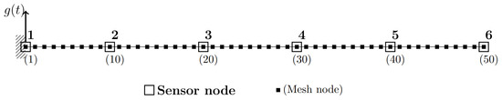 The structure to be used as a data generator is a 5 m long cantilever beam with a rectangular cross-section of 0.012 m × 0.006 m. The beam was modeled as a two-dimensional linear structure in Abaqus [36], with transverse vibrations along its 0.006 m thickness considered as the DOFs of interest. The beam is made of steel, with a mass density of 7800 kg/m3, a Young’s modulus E of 210 GPa, and a Poisson’s coefficient of 0.3. In Figure 2, the finite element (FE) mesh is shown, along with the locations of six virtual accelerometers positioned to measure transverse vibrations relative to the beam axis. The mesh consists of 49 two-dimensional beam elements with linear interpolation (labeled as B12 in the Abaqus nomenclature), with a total of 50 nodes, where node 1 represents the clamped edge and node 50 corresponds to the free edge. The damping matrix is modeled as proportional to mass and stiffness matrices and , such that: