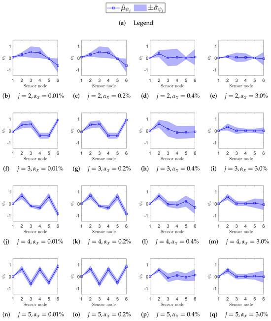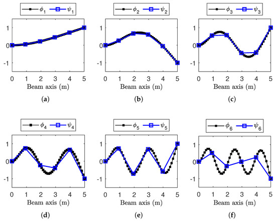 To simulate a practical SHM application, where only a subset of the structure DOFs is equipped with sensors, the mode shapes are henceforth denoted as , representing only at the sensor locations (i.e., ). This implicitly restricts the analysis up to the fifth resonance (), since the SHM system depicted in Figure 2 consists of only sensor nodes (sensitive to the DOF transversal to the beam axis), and spatial aliasing occurs from (Figure 3f) onward.