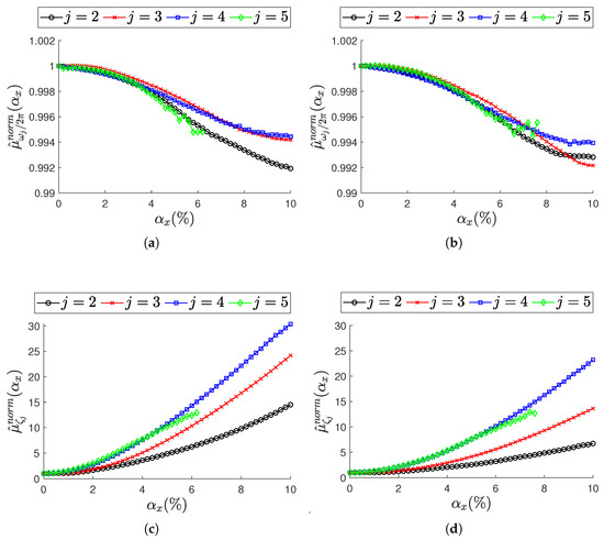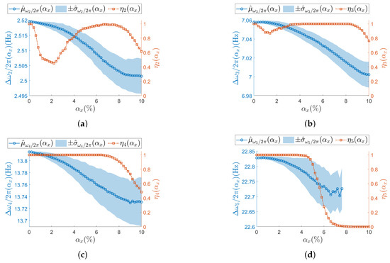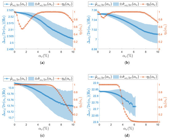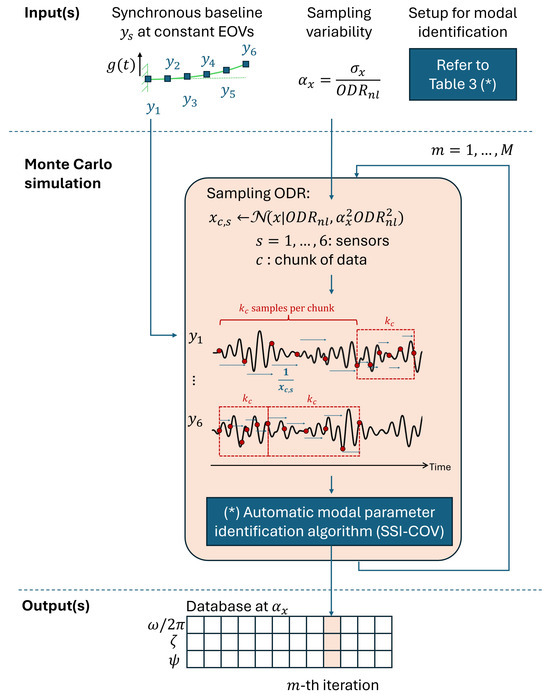 Finally, SSI-COV intentionally assumes to be sampled at nominal ODR (), forcing the non-deterministic sampling to manifest itself on the operational modal parameters. For each Monte Carlo iteration, SSI-COV provides a triplet composed of the natural frequency , the damping ratio , and the mode shape vector for each identified resonance.