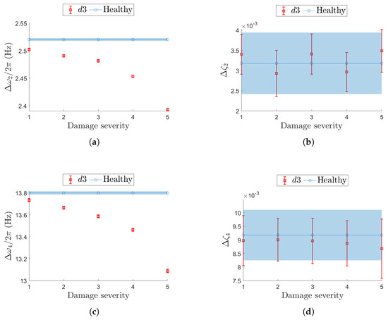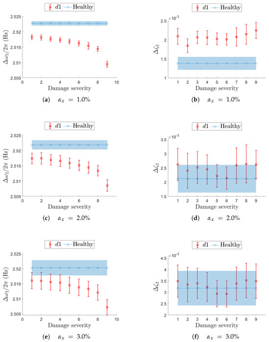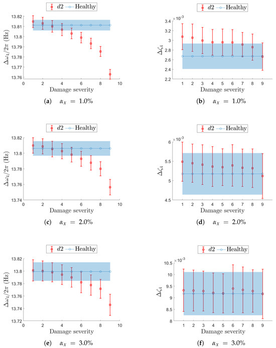 Localized damages, and , involve three consecutive elements of the FE mesh, while distributed damage, , corresponds to the same reduction in stiffness in all elements of the mesh. Different severity levels, labeled for increasing values of , are reported in Table 2. The value of is intended differently for localized and distributed damage: in the first case, indicates the reduction in stiffness in the central element of the three elements that contribute to the damaged zone, while the lateral elements are to be considered for a reduction equal to ; in the second case, the reduction in stiffness applies to all elements of the beam FE mesh.