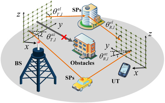 The vector is defined as the transmitting direction along the l-th path. Likewise, is expressed as the receiving direction along the l-th path. The geometric relationship between the UT, SPs and BS can be described as