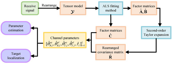 where and . Finally, the proposed tensor-based channel parameter estimation and localization algorithm is shown in Algorithm 1. In addition, the algorithm process is presented in the form of a block diagram in Figure 3.