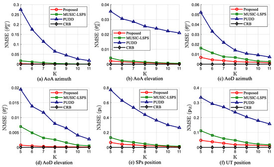 - The positions of both the Scattering Points (SPs) and UT can be obtained in closed form based on their geometric relationships with the BS, enabling precise localization accuracy. Furthermore, the Cramér–Rao Bounds (CRBs) of channel parameters and positions are derived as theoretical lower bounds. Finally, numerical simulations validate that the proposed tensor-based algorithm achieves superior ISAC performance compared with the existing Phase Unwrapping for Distance Difference (PUDD) [39] and MUSIC-Like Spectrum Peak Searching (MUSIC-LSPS) [40] algorithms, and results are closer to the CRBs.