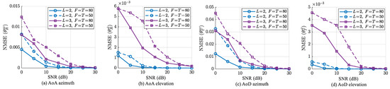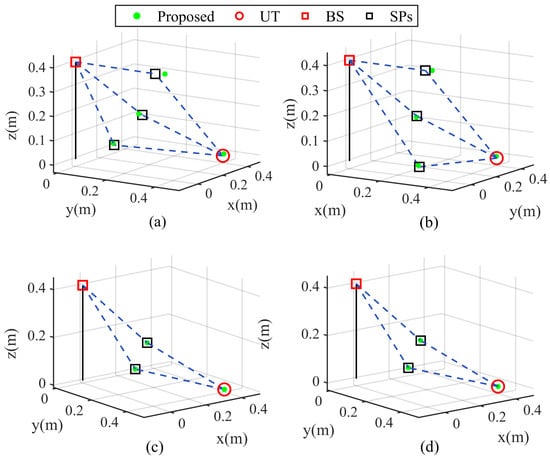 where represents the delta function, is the ToA for path l, and represent the distances from the l-th SP to the centers of receiver and transmitter arrays, is the complex gain for path l, and and are the azimuth and elevation angles at the UT (BS), respectively. The -th and -th elements of antenna array response vectors and at the UT and BS are represented, respectively, as [45]