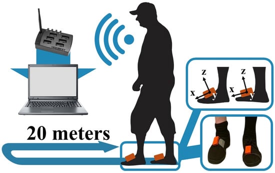 The experimental setup involved the use of 2 MTw triaxial IMUs (Xsens, Movella Inc., Henderson, NV, USA) placed on the feet through elastic Velcro bands. Data from the IMUs were collected using an Awinda station connected to a PC, with a sampling rate of 100 Hz via the MT Manager 4.6 software (Movella Inc., Henderson, NV, USA). All tests were conducted along a straight, unobstructed corridor approximately 20 m in length, allowing the acquisition of 40 test strides per participant. A schematic representation of the experimental setup is provided in Figure 1.