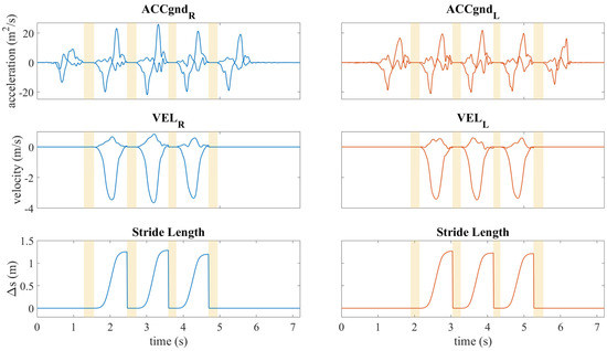 Illustration of the ZUPT algorithm applied to stride length estimation. The top panels illustrate the two horizontal components of acceleration in the global coordinate system for both feet (ACCgndR and ACCgndL are the accelerations of the right and left foot in the global coordinate system). The middle panels illustrate the horizontal components of velocity (VELR and VELL are the velocities of the right and left foot in the global coordinate system), while the bottom panels depict the horizontal displacement. Yellow-shaded regions indicate the flat foot intervals used in the ZUPT correction process.