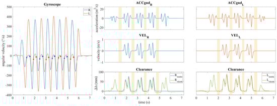 The subsequent illustration delineates the procedural framework of the ZUPT algorithm for clearance measurement. The left and right sensor angular velocity values are represented on the left panel, with diamonds indicating TS points and circles indicating HO points, which identify the flat foot intervals to be brought to zero. The top panels illustrate the vertical acceleration trends within the global reference system (ACCgndR and ACCgndL are the accelerations of the right and left foot in the global coordinate system). The middle panels illustrate the trends of the vertical component of velocity (VELR and VELL are the velocities of the right and left foot in the global coordinate system). The bottom panels illustrate the concurrent trends of clearance obtained from the IMUs and the optoelectronic system. Yellow bands indicate flat foot intervals used for correction.