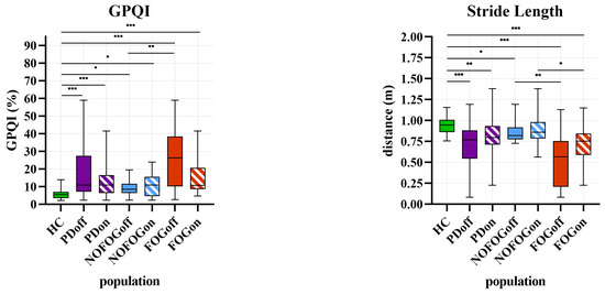 The Mann–Whitney U test revealed statistically significant differences, with p < 0.05, exclusively in the HC vs. PDon and HC vs. FOGon comparisons.
