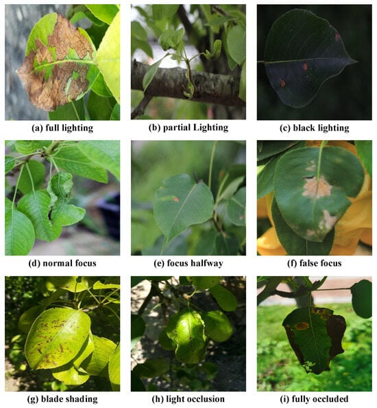 In this study, images of three types of diseases were collected: rust, brown spot, and leaf curl. The data mainly came from Dangshan, Suzhou, Anhui Province; Yingshang County, Fuyang City; and Tianmen Town, Tongling City, Anhui Province, China. Considering the impact of different lighting conditions, images of diseased leaves were taken at different times of the day from multiple angles. Additionally, to address the issue that many existing datasets deliberately focus on the diseased regions during collection—potentially reducing the model’s adaptability to disease recognition in real natural environments—we avoided intentionally focusing on diseased areas. Instead, we captured images containing the complete disease manifestation to better simulate how diseases appear in natural environments, thus enhancing the model’s generalization ability in real-world scenarios. All images were captured in outdoor environments, using a Canon 700D camera (Canon Inc., Hefei, China) and an Apple iPhone 15 Pro (Apple Inc., Hefei, China). An example of the captured samples is shown in Figure 1.