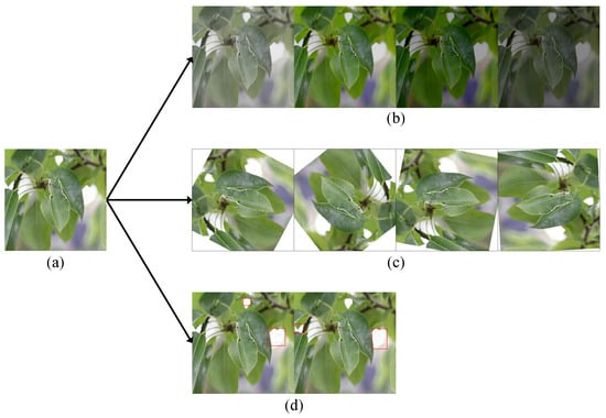 Data augmentation examples showing different conditions. (a) is original image. (b) is an enhanced image that has been adjusted for brightness and contrast, and processed by color transformation. (c) is an enhanced image after random rotation. (d) is an enhanced plot with Gaussian noise added.