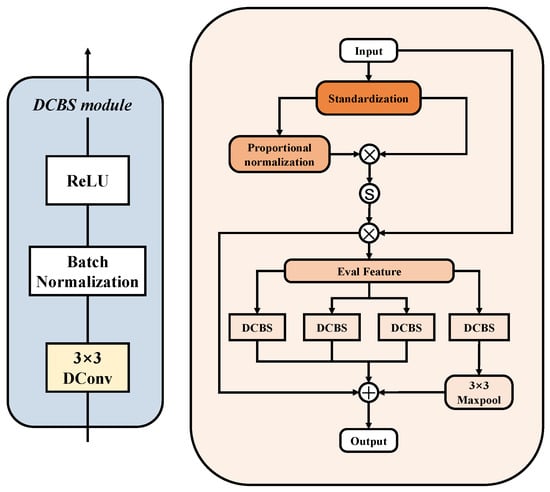 A multi-branch structure is used to perform multi-scale feature extraction on . Specifically, multiple parallel DCBS modules are employed to extract global information from the input features, combined with max-pooling convolution to capture salient features from different regions. In the DCBS module, dilated convolutions with different dilation rates enhance the model’s ability to capture multi-scale information, effectively expanding the receptive field without increasing the number of parameters. The designed parallel structure overcomes the loss of long-distance information correlation caused by the grid effect, while also avoiding detail loss due to incomplete pixel participation. The DCBS module is represented as follows: