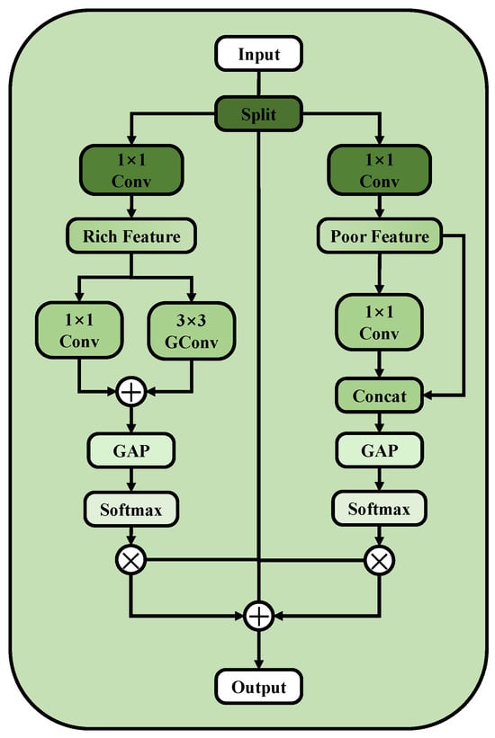 The AGC module mainly adopts a dual-branch structure, as shown in Figure 6. First, through the channel split operation, is split into two features and , each containing different levels of information richness, where the number of channels is and , respectively. This is intended to reduce interference between different disease features and enhance the independence and clarity of each type of disease feature. The channel splitting process can be represented as follows: