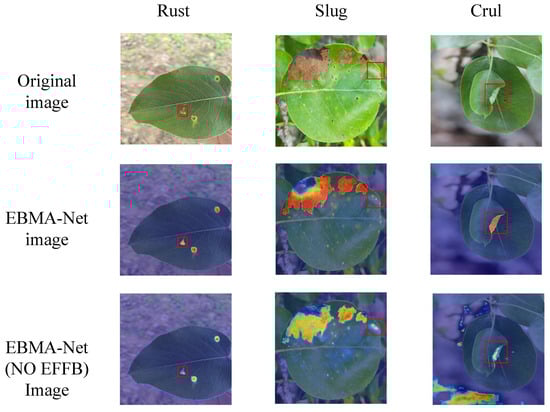 To intuitively demonstrate the effectiveness of our designed edge extraction branch (EFFB), we visualized the attention points of the EBMA-Net model with and without the EFFB branch based on Grad-CAM technology. The visualization heatmap results are shown in Figure 8.