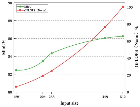 The resolution of the input image directly affects the training efficiency and performance of the model. As the input scale increases, the model can capture more detailed features, but it also significantly impacts training speed. Figure 9 shows the relationship line chart between the main metric (MIoU) and normalized computational load at different input scales. As can be seen from Figure 9, as the resolution increases, the model’s performance gradually saturates, with limited improvement in evaluation metrics while training costs increase significantly. Therefore, all experiments in our design chose an input resolution of 512 × 512, which effectively balances computational cost and training speed while maintaining high model performance.