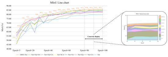 In addition, Figure 10 shows the changes in MIoU as the baseline model gradually adds each module. It can be observed that as the number of training epochs increases, the MIoU gradually converges. Although MIoU still shows a slight upward trend, the required number of training epochs increases significantly. This indicates that our model has been sufficiently trained on the training set, without showing signs of overfitting.