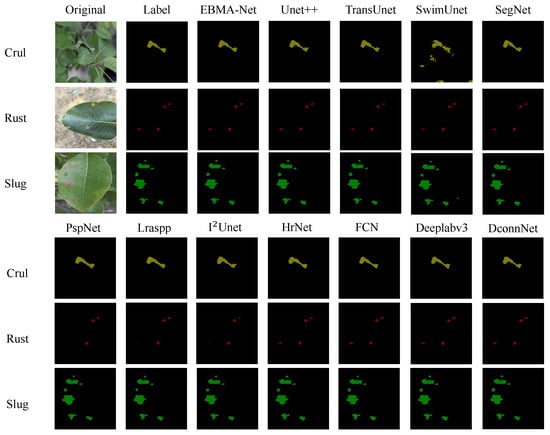 In the comparison experiments, we evaluated several state-of-the-art segmentation network models to analyze their performance in different scenarios. The comparison networks included classic U-shaped structures and their improved versions (UNet [7], UNet++ [23], I2UNet [24]), transformer-based networks (TransNet [25], SwinUNet [26]), encoder–decoder semantic segmentation networks (SegNet [27], FCN [28]), deep convolution-based networks (DeepLabv3 [29], DconnNet [30], LRASPP [31]), advanced residual networks (HRNet [32]), and networks that integrate multi-scale contextual information (PSPNet [33]). These networks cover the application of classical convolutional neural networks to modern attention mechanisms in semantic segmentation, aiming to comprehensively compare the performance of different methods in disease recognition tasks.