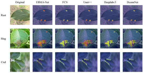 We conducted experimental comparisons between these networks and the proposed EBMA-Net. The results, summarized in Table 10, show each model’s performance on different evaluation metrics, including MIoU (Mean Intersection over Union), MPA (Mean Pixel Accuracy), Dice coefficient, model parameters (Parameters), and inference speed measured in FPS (Frames Per Second). These results provide an intuitive comparison of the strengths and weaknesses of each model in disease segmentation tasks and validate the effectiveness of our proposed EBMA-Net. The specific results are shown in Table 10.