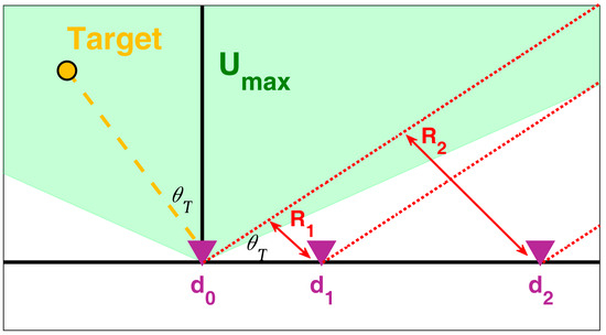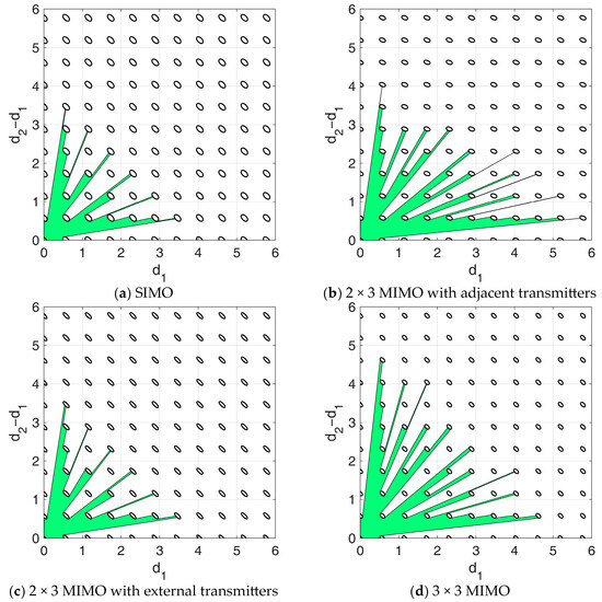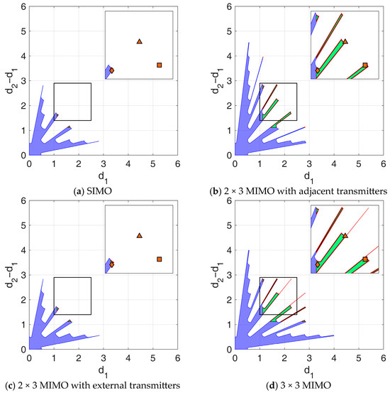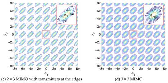 Although this case has no direct relationship with the previous ones, we notice that it can be obtained from the first one by defining , which again transforms Equation (24) in the TX functional of the first case, while the RX functional remains unchanged thanks to its symmetry properties listed above. Contour plots of the likelihood function in the 2 × 3 MIMO cases are shown in Figure 4b,c. Specifically, in Figure 4b, we assume adjacent transmitters, with the receiving-only antenna located at the leftmost array element. The symmetric case is not included, as the likelihood function appears identical. Furthermore, Figure 4d shows the likelihood function contour plot obtained in the 2 × 3 MIMO case with transmitters located at the edges of the array.