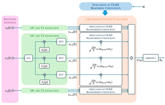 To obtain an estimate of the target DoA , we resort to the ML estimation technique. A block diagram of the fundamental processing scheme considered in this paper is shown in Figure 2. Specifically, the received signals at different antennas are first range-compressed via matched filtering, which involves multiplying the received signal spectrum by the complex conjugate of the spectrum of each transmitted signal, . This is performed by the block named “MF and TX separation”, which is exploded in its details only for channel k = 1 for compactness. This operation enables both target range estimation and separation of the contributions from each transmitter at each receiver. For simplicity, in Figure 2, the range compression process is represented assuming that transmitters are present. In cases with or transmitters, the processing scheme is simplified accordingly.