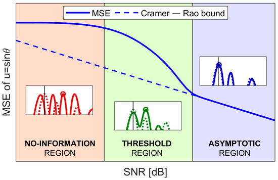 This SNR value also determines the lower limit of the so-called threshold region [16], where the probability of outliers is non-negligible, and the achieved MSE deviates from the CRB. When the input SNR is high enough, the probability of outliers becomes negligible, making the CRB a good approximation of the MSE. Since in this case the asymptotic performance is reached, this SNR region is referred to as the asymptotic region in [16]. Lastly, when the SNR is too low, the union bound approximation is no longer valid, meaning that there is a non-negligible probability of multiple side peaks being higher than the main lobe peak. Under this condition, the DoA can no longer be estimated, so this SNR region is referred to as the no-information region in [16]. A qualitative overview of the three regions described is shown in Figure 3.