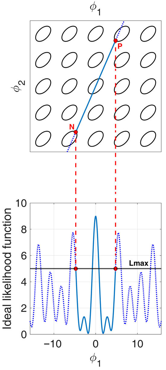 Therefore, the locus of points in the plane corresponding to the likelihood function cut at is obtained by applying the inverse coordinate transformation to Equation (37) and imposing condition Equation (A10), namely: