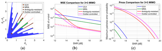 Figure 9b,c compare the MSE and maximum pairwise error probability for these configurations. As expected, the short-aperture ULA and MRA achieve asymptotic performance within the considered range of SNR values, exhibiting negligible outlier probability. However, their short baselines result in a relatively high CRB, which limits their asymptotic accuracy.