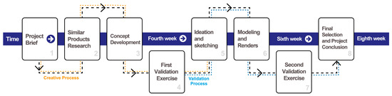 - Rojas, J.-C.; Trujillo, J.L.H.; Muniz, G.; Marin-Morales, J. Product Validation in Creative Processes: A Gender Perspective in Industrial Design Projects. In Proceedings of the 2021 IEEE Global Engineering Education Conference (EDUCON), Vienna, Austria, 21–23 April 2021; IEEE: New York, NY, USA, 2021; pp. 755–760. [Google Scholar]