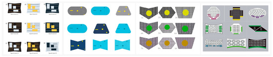 - Concept development: A creative process was designed with a focus on visual perception, drawing on principles from Gestalt theory and related applications [64,65,66]. Students created a series of tool board archetypes using basic shapes, geometric silhouettes, and contrasting colors. In total, approximately 25 to 27 boards were developed (see Figure 2).