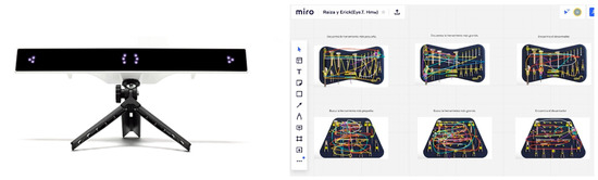 - Second validation exercise (validation with ET/AT technology): The next phase took place during the sixth week and involved the use of technology. Students repeated the process of creating their research protocol, but in this case, it was designed for the use of the tools and their selected boards. As previously noted, two student groups participated: one group used ET technology in the classroom, while the other employed an AT method in an online setting. The ET device used was the GP3 HD (Version 5.3.0) by Gazepoint®, Vancouver, BC, Canada (https://www.gazept.com/), a low-cost eye-tracking system operating at 150 Hz, based on Gazepoint’s proprietary platform for eye movement quantification (see Figure 4, left). The AT method utilized the MIRO© platform, Amsterdam, Netherlands (www.miro.com), which incorporated mouse tracking [58] to simulate eye movements during the online activity (see Figure 4, right).