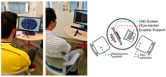 The second validation experience of the DPMT was carried out by the student teams using both technologies. The same dynamics from the initial non-technological validation were replicated. As part of the evaluation protocol, participants were asked to search for tools, with the tracking of search time and movement trajectories. However, in this phase, the data were collected directly through the ET or AT platforms. Students invited faculty members and fellow students to participate in the evaluation protocol. For the ET application, Figure 5 shows the setup for the use of ET equipment. This configuration follows a traditional arrangement, with the screen and sensor bar positioned at the bottom, maintaining a distance of approximately 50–70 cm from the participant. In the case of the online group, students used Zoom® to conduct the evaluation using the AT method.
