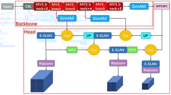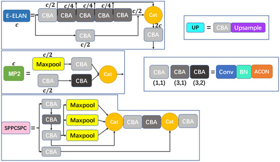 The SMA-YOLO model structure is shown in Figure 1, and the detailed structure of each module is shown in Figure 2. In particular, the structure of the CBA module is Conv+BN+ACON, which accelerates and optimizes the convolutional neural network. The efficient aggregation network E-ELAN can improve the accuracy and efficiency of target detection. The SPPCSPC structure connects the SPP (Spatial Pyramid Pooling) module and the CSPC (Cross Stage Partial Connections) module in series to obtain richer feature representation, which improves the accuracy of the image classification task while guaranteeing the high efficiency of the network. The main role of the MP2 module is to introduce multiscale information into the deep neural network, so as to improve the network’s target object perception and classification accuracy.
