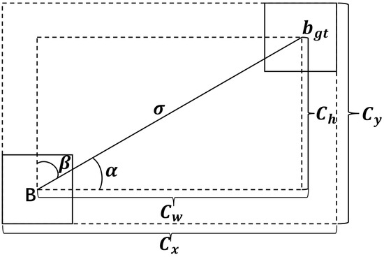 When the width-to-height ratio of the predicted frame and the real frame is the same, is equal to 0. At this time, the effect of the aspect ratio penalty term disappears and the CIoU loss function is less effective. Therefore, the SIoU loss function [19] was selected instead of CIoU in this study. The angular cost is introduced in the SIoU loss function to redescribe the distance, which reduces the total degrees of freedom of the loss function. The meanings of the parameters in the SIoU loss function are shown in Figure 4.