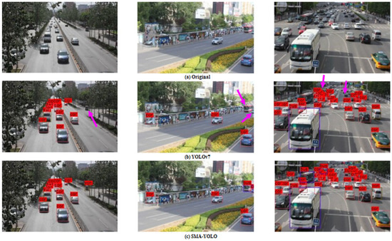 Comparing the three images in the first column of Figure 5, it can be seen that the proposed SMA-YOLO model was able to correctly detect the trucks that were missed by the YOLOv7 model, indicated by pink arrows. Comparing the three images in the second column of Figure 5, it can be seen that the YOLOv7 model missed the buses and the cars indicated by pink arrows in the distance, while the proposed SMA-YOLO model was able to accurately detect the locations and types of these two targets. As can be seen by comparing the three images in the third column of Figure 5, in terms of vehicle density, the YOLOv7 model missed the small targets in the distance and the partially covered vehicles indicated by pink arrows, while the proposed SMA-YOLO model was able to detect these missed vehicles correctly. Therefore, we may conclude that our proposed SMA-YOLO model can detect small and distant targets in the image more accurately, with better detection in complex road scenes.